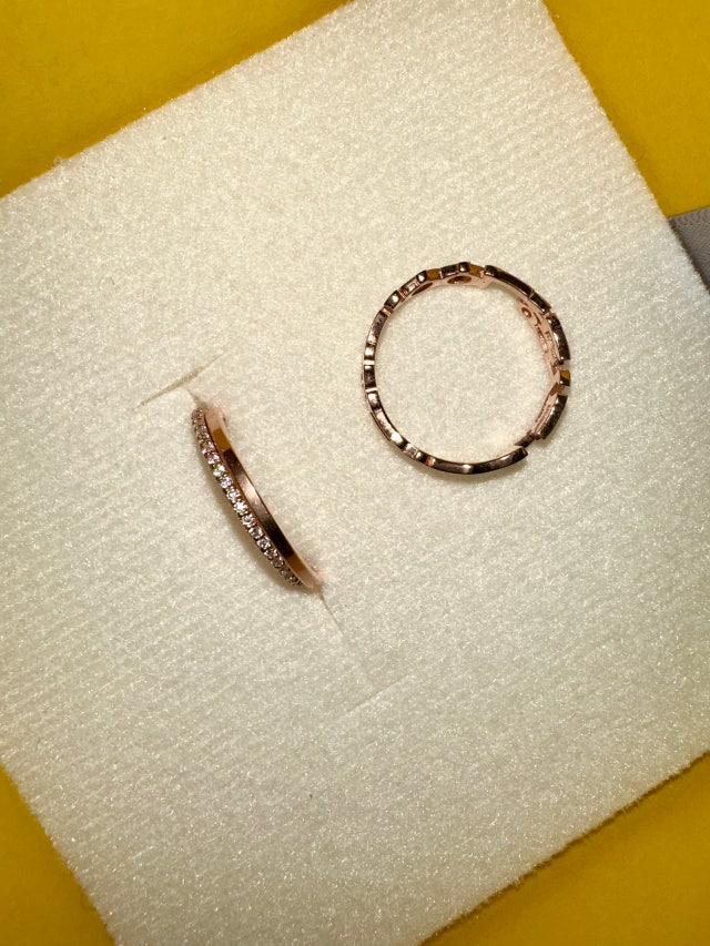 테시의 반지 3종류 구매했고 다 같은 사이즈로 주문했는데 자음 반지에 비해서 얇아서 인지 조금 더 크게 느껴집니다! 모이사나이트가 전체 다 박힌건 아니고 반 조금 넘게 콕콕 박혀있는데 중간 중간 돌려줘야하지만 반짝반짝 예뻐요!! 사진으로는 잘 안나와서 아쉬워요..