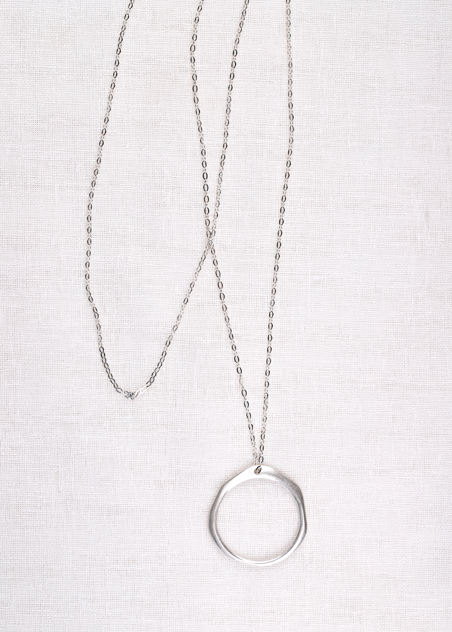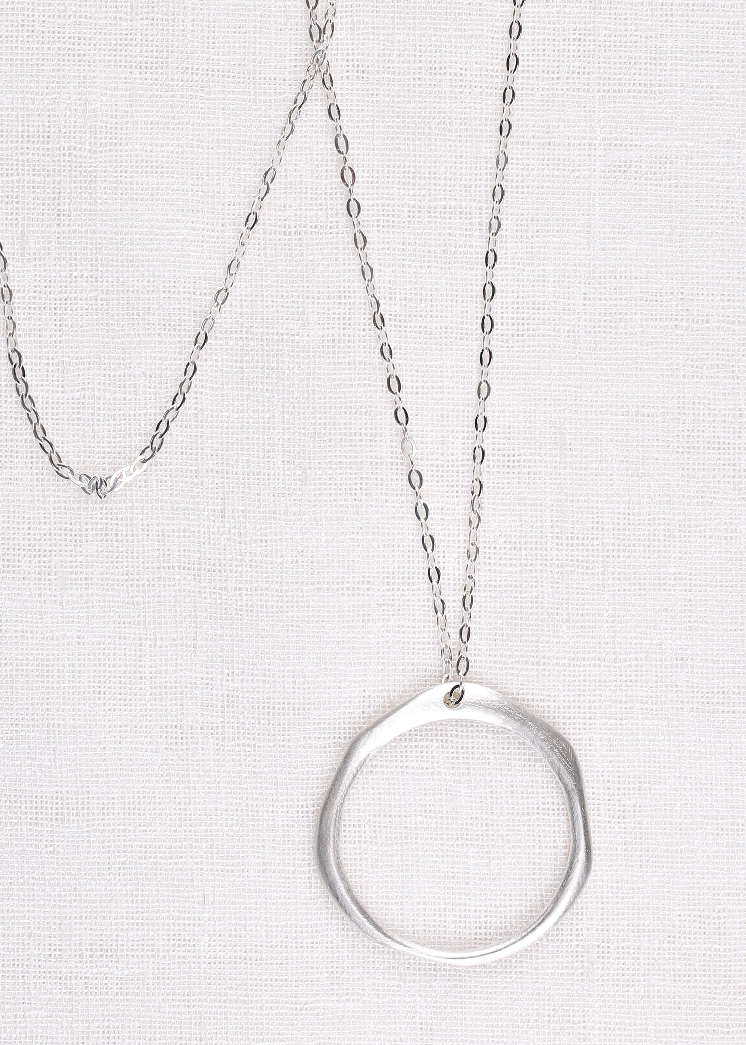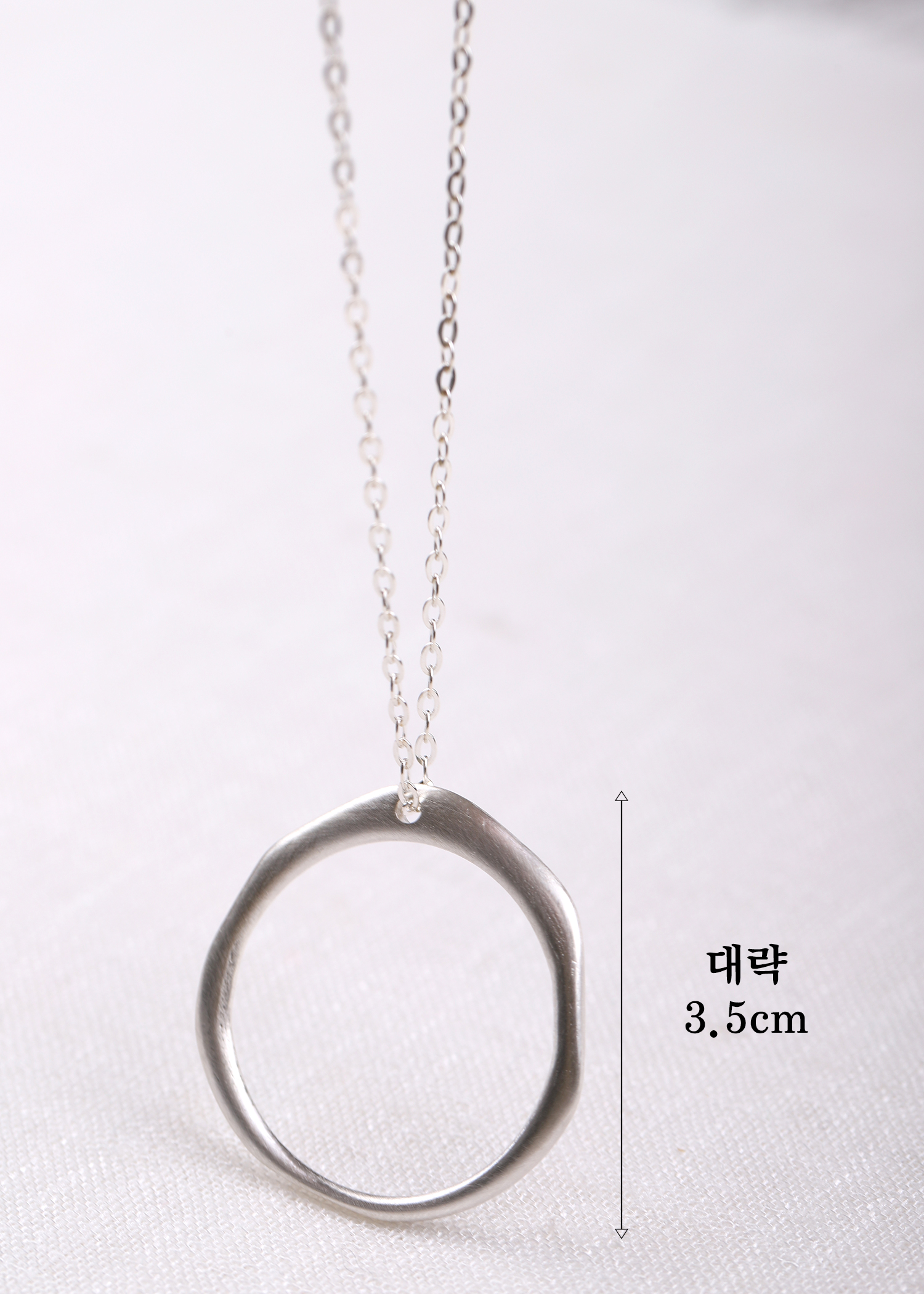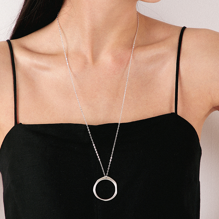 무광의 라운드 모양의 팬던트에 커팅이 많이 들어간 롱체인으로 매칭한 목걸이입니다.