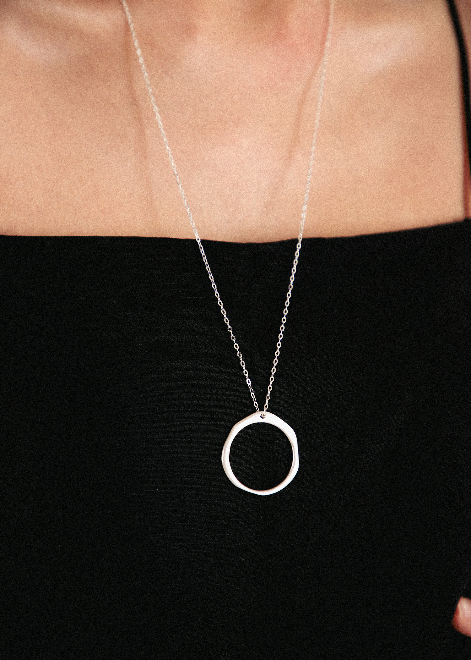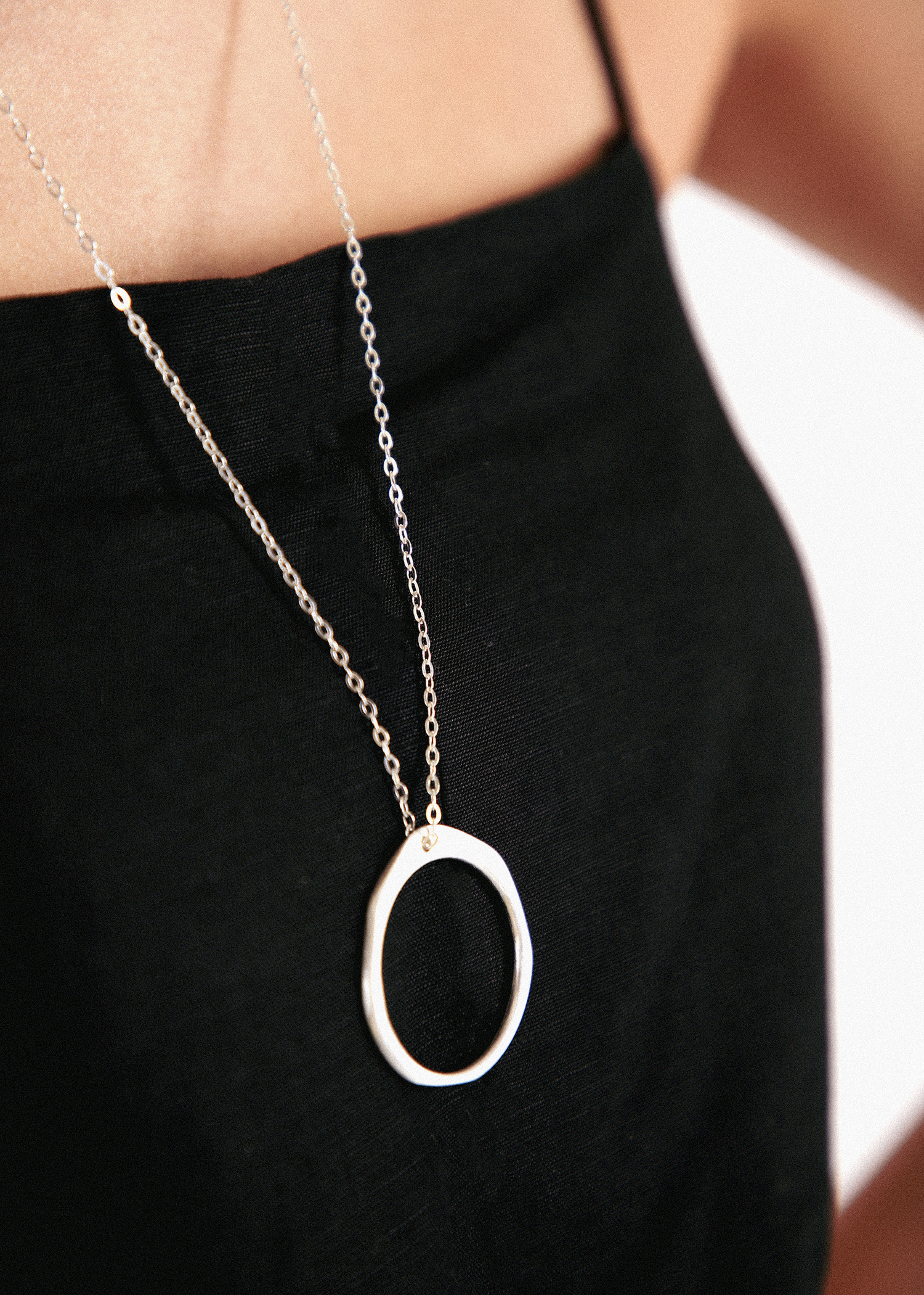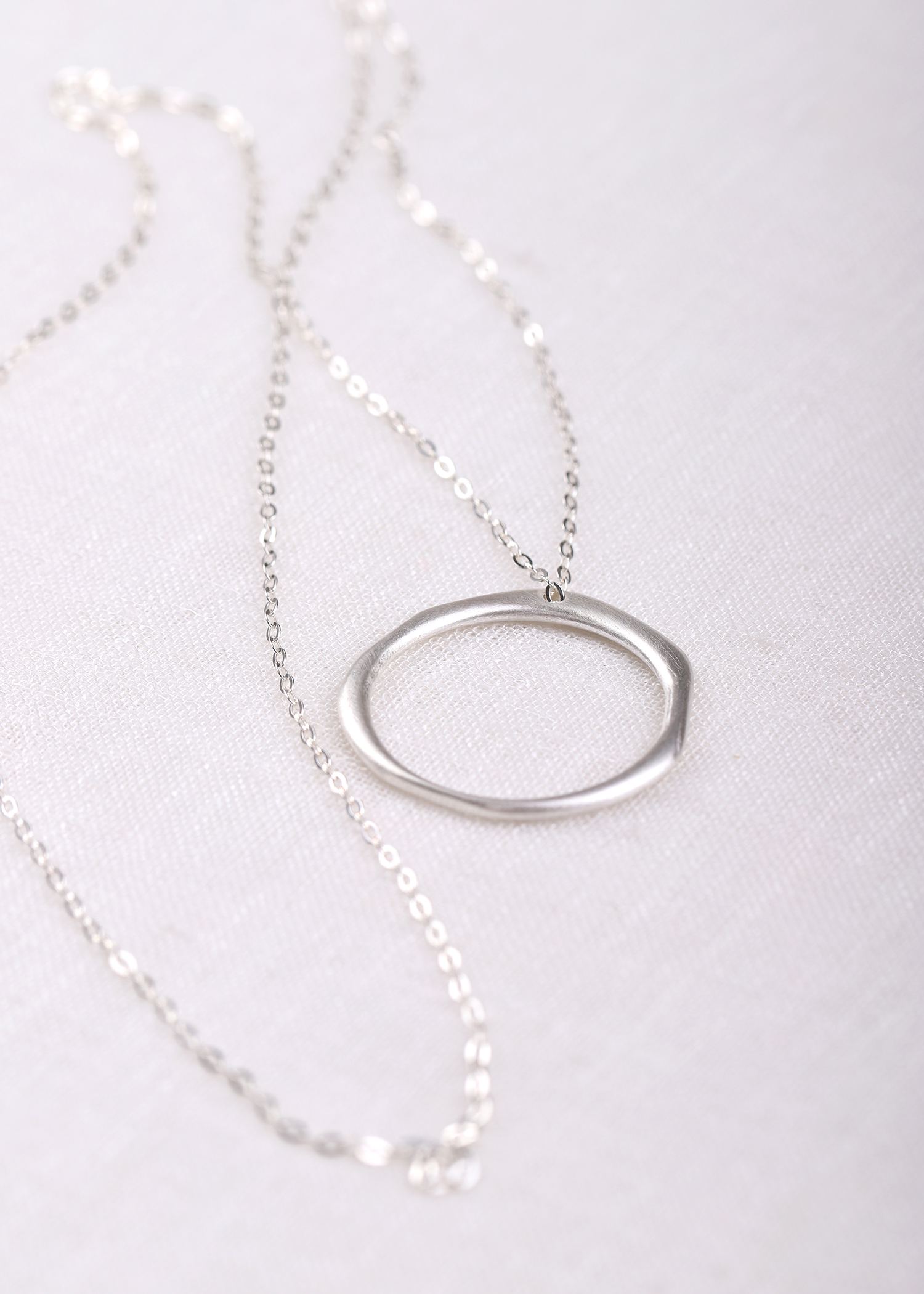 무광의 라운드 모양의 팬던트에 커팅이 많이 들어간 롱체인으로 매칭한 목걸이입니다.